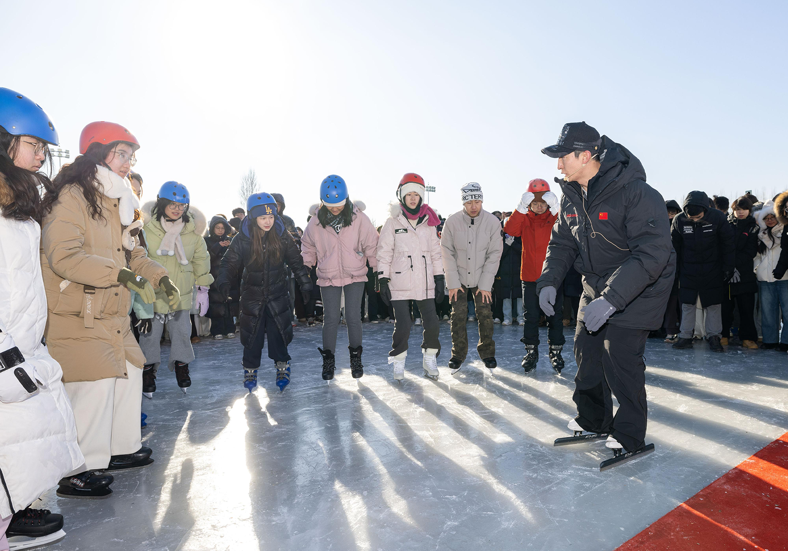 冰上练习。“单脚原地支撑练习 ,单脚行进间的支撑练习。”让学生体会滑冰时重心的位置,以及单脚支撑重心的感觉。这样循序渐进的教学内容安排 ,非常符合冰雪运动微专业学生零基础的特点 。面对紧张到不敢迈步的学员,他分享起自己儿时后半夜练冰、就着冷风吃包子的经历:“热爱是扛过煎熬的良药,我也是从跌跌撞撞开始的。”