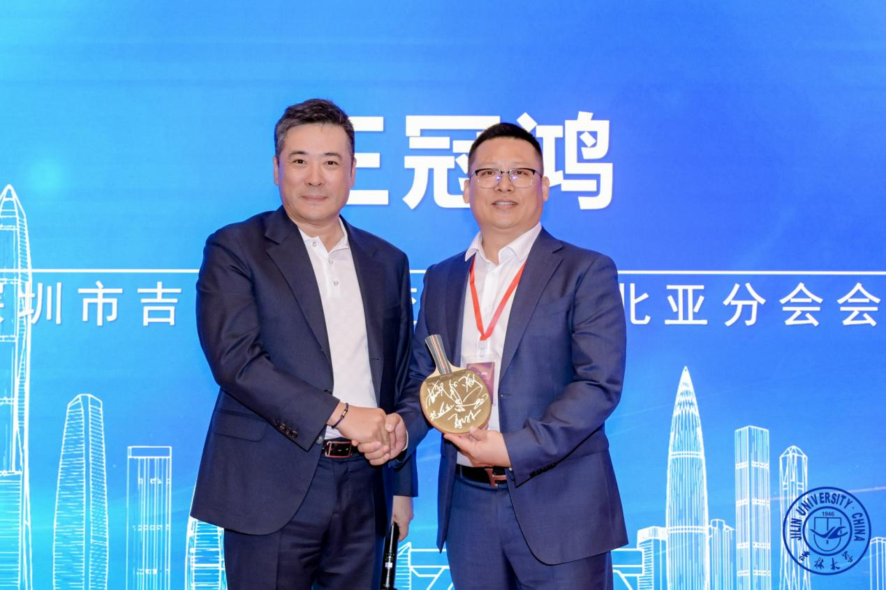 仪式现场温情洋溢,深圳市吉林大学校友会东北亚分会会长王冠鸿向体育学院分会赠送一份独具意义的礼物——纪念版乒乓球明星签名球拍。这份凝结体育情怀与校友祝福的珍贵纪念,不仅象征着拼搏进取的体育精神,也承载着各兄弟分会之间携手同心、互助共进的美好情谊。分会代表接受赠礼,并对这份情谊深厚、寓意深远的支持表示衷心感谢。