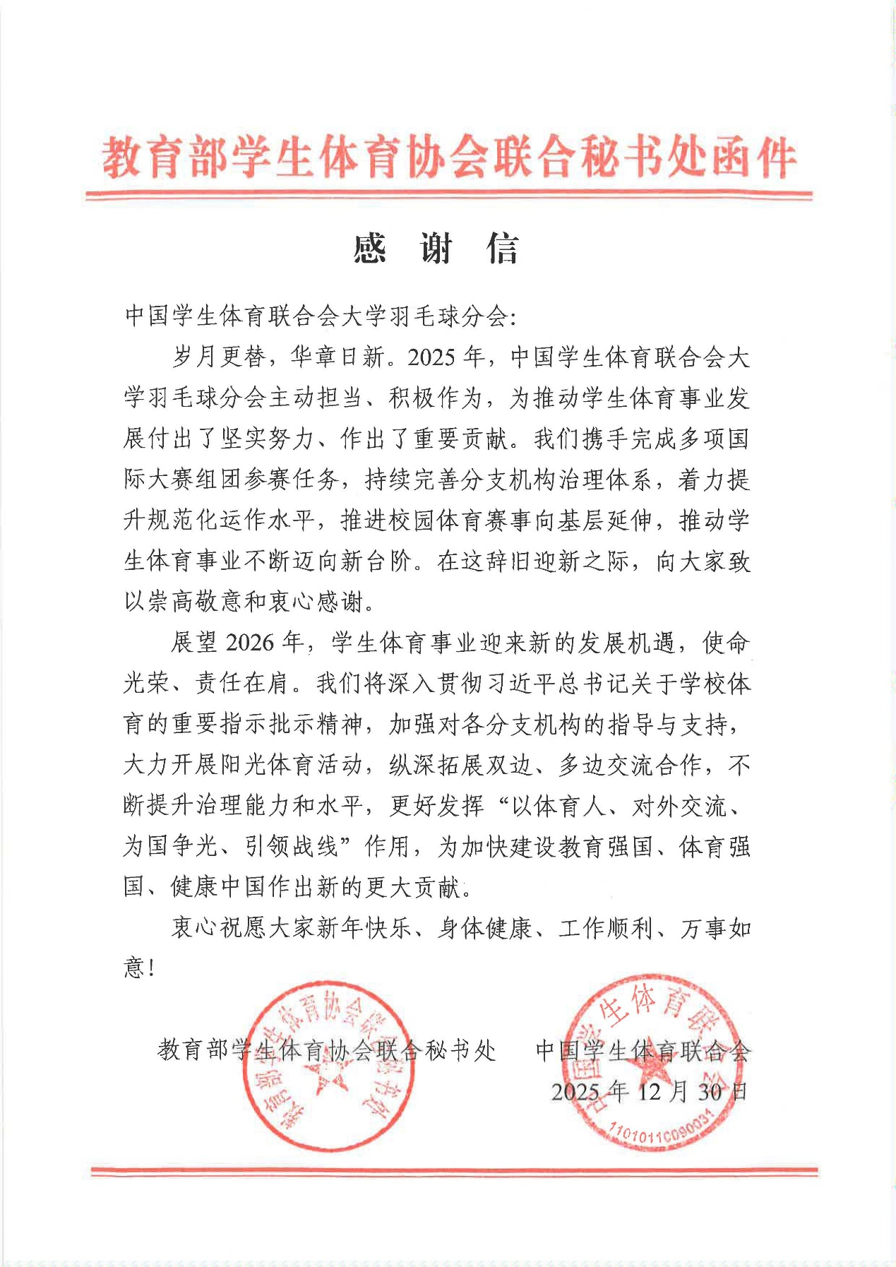 信中提到:“在2025年,中国学生体育联合会大学羽毛球分会携手完成多项国际大赛的组团参赛任务,持续完善分支机构治理体系,着力提升规范化运作水平,推动学生体育事业不断迈向新台阶。”这一成就彰显了吉林大学体育学院在提升学生体育活动质量和促进学生全面发展方面的重要作用。
